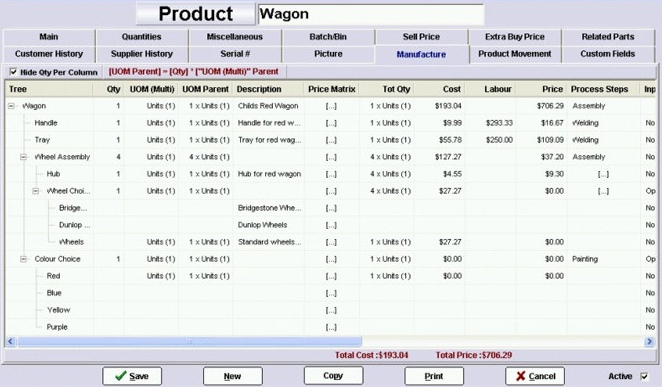 Manufacturing in TrueERP is live in all areas including product cost updating. As the cost (and sell) on any product, item or service used in the manufacture process is changed, the unit, bill of materials, and manufacture process is also updated with this change. This ensures accurate data at all times.